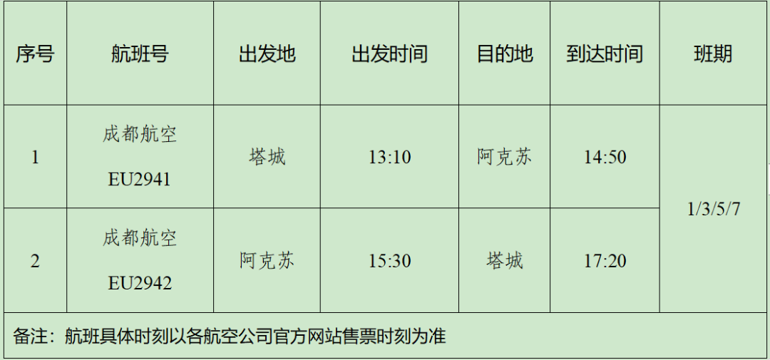 好消息!塔城机场新增塔城至阿克苏航线~ 2024-01-12 11:30:05 塔城零距离 点击:[] 打印 分享到: 为进一步方便公、商务及百姓的出行,促进塔城、阿克苏两地间的交往、交融,塔城地区将新开通塔城至阿克苏航线,由成都航空公司执飞并计划1月16日首航。为了方便群众出行特梳理汇总了航线时刻具体如下 【关闭】