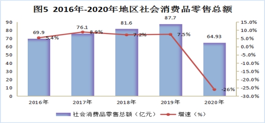 全年社会消费品零售总额64.93亿元,比上年下降26%。按经营地统计,城镇消费品零售额47.35亿元,下降24.6%;乡村消费品零售额17.58亿元,下降29.4%。按消费形态统计,商品零售额55.13亿元,下降24.27%;餐饮收入额9.8亿元,下降34.42%。