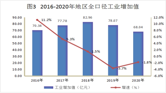 全年全地区工业增加值68.04亿元,下降1.8%。其中:地方规模以上工业增加值下降2.9%。在地方规模以上工业中,分经济类型看,国有控股企业增加长20.6%,股份制企业下降2.9%,外商及港澳台商投资企业下降41.9%,私营企业增长11.3%。分工业门类看,采矿业增长3.7%,制造业下降20%,电力、热力生产和供应业增长21.5%。分轻重工业看,轻工业下降43.1%,重工业增长11.3%。