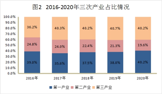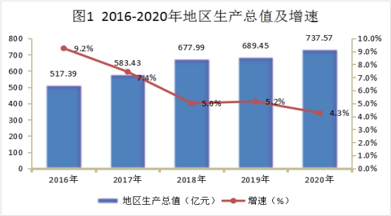 初步核算,全年实现地区生产总值(GDP)737.57亿元,比上年增长4.3%。其中,第一产业增加值296.64亿元,增长3.7%;第二产业增加值144.51亿元,增长3.3%;第三产业增加值296.42亿元,增长5.3%。三次产业比例为40.2:19.6:40.2。第一产业对经济增长的贡献率为30%,拉动经济增长1.3个百分点;第二产业贡献率为18.9%,拉动0.8个百分点;第三产业贡献率为51.1%,拉动2.2个百分点。