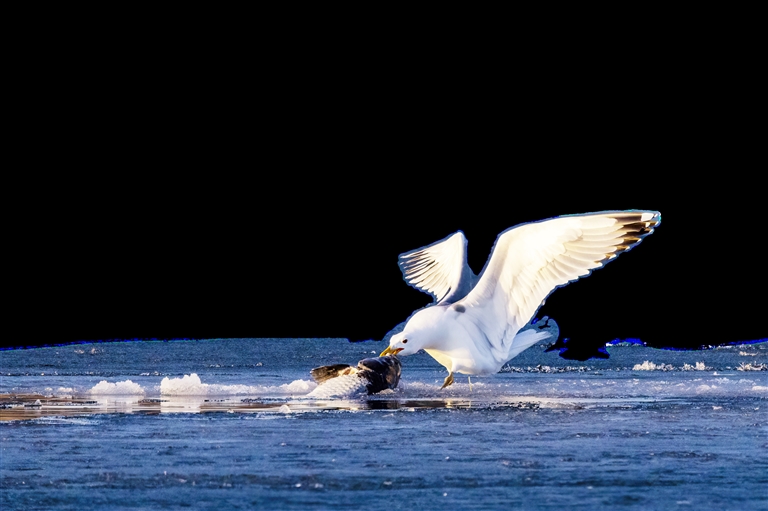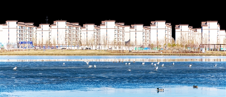 □迁徙季节,渔鸥、野鸭等水鸟在塔城市千泉湖嬉戏
