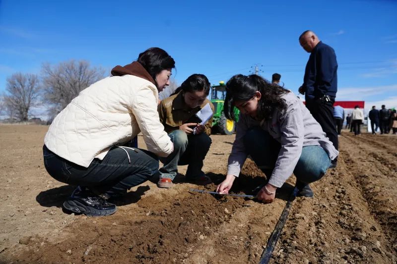 观看播种作业后情况。塔城地区融媒体中心记者代姣美摄