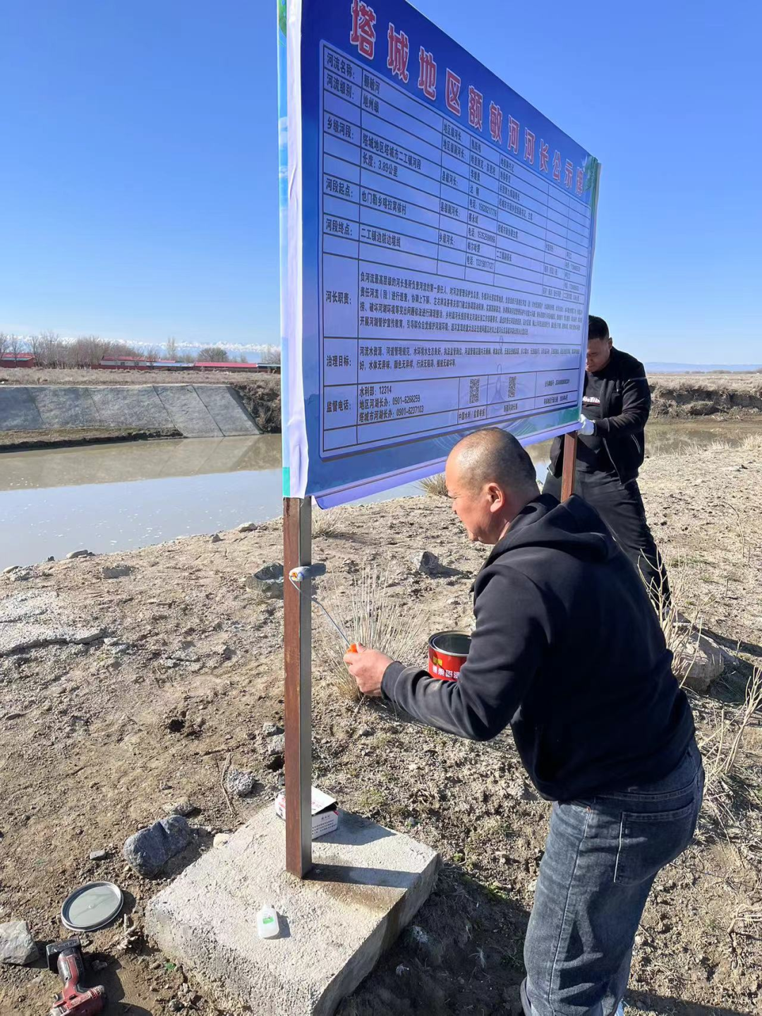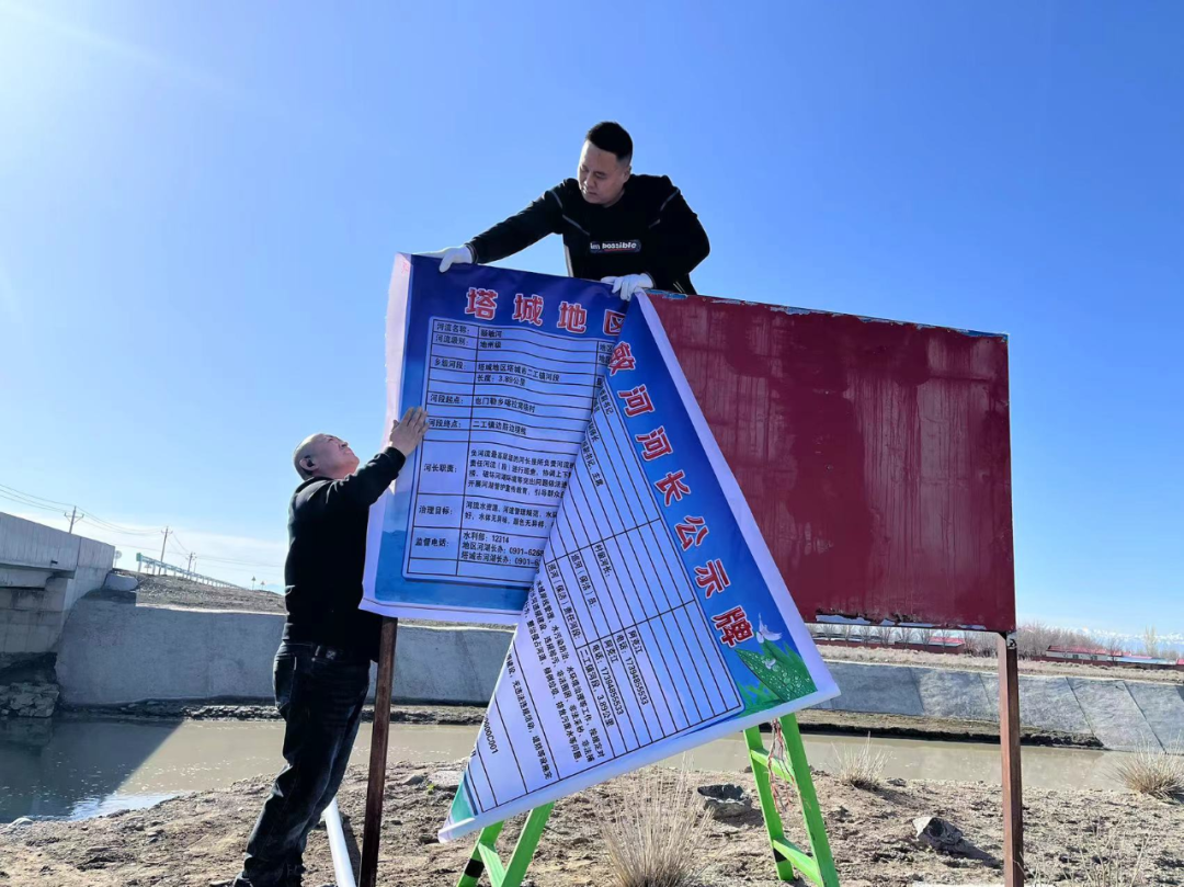 工作人员更换河长制公示牌。塔城地区融媒体中心通讯员李晓燕摄