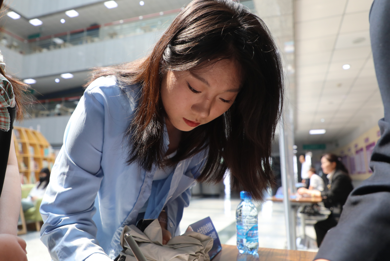 招聘会现场学生正在填写就业意向书。