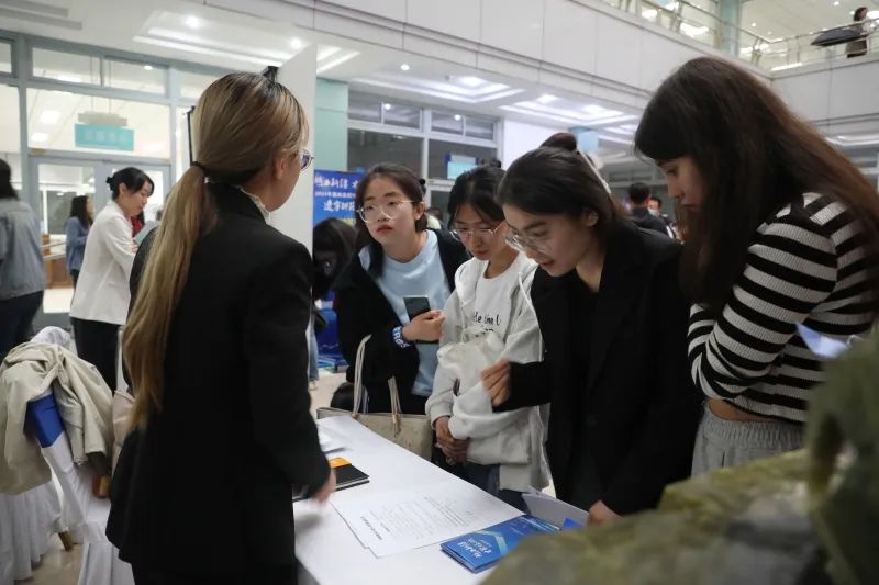 在现场招聘展位,招聘单位工作人员向学生们发放人才引进宣传册,面对面对学生关心的薪资待遇、生活保障、人才引进政策、岗位详细信息等进行耐心解答。此行招聘会现场吸引了一万余名应届毕业生前来咨询。