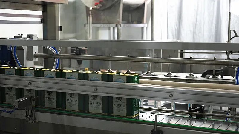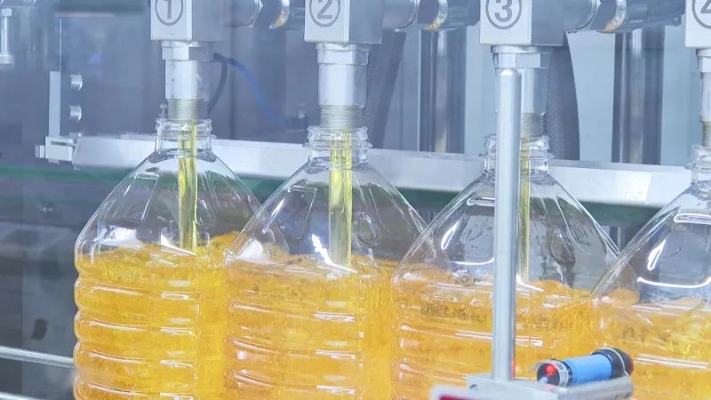 6月21日,记者在乌苏市西葵食品有限公司看到,工人们在食用油灌装生产线上忙碌着,一桶桶食用油经过灌油、加盖、封瓶等环节后集中进行装箱。
