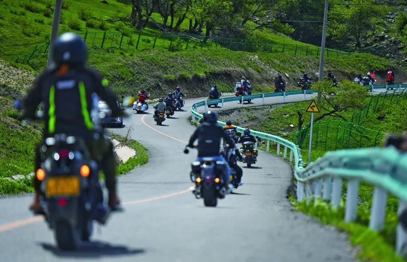 5月19日,参加自驾游发车仪式的摩托车选手从额敏县野果林景区出发。汤永/摄