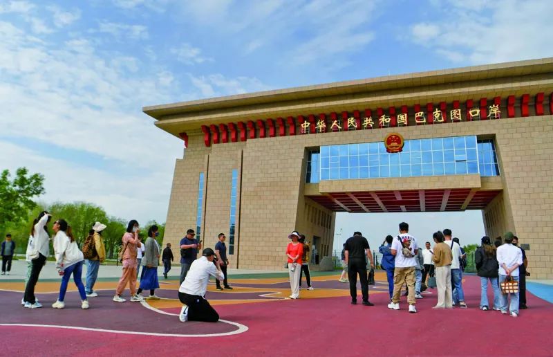 游客在巴克图口岸国门广场前拍照。汤永/摄