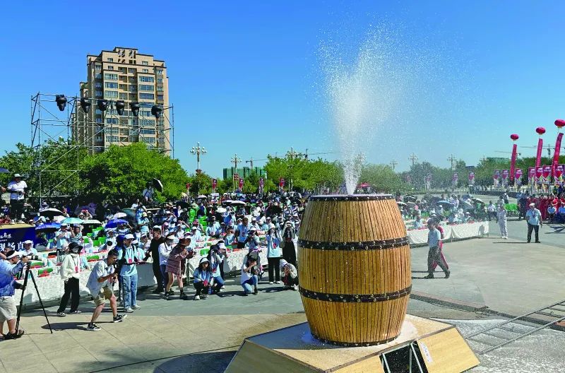 新疆塔城乌苏啤酒节开幕式上开启第一桶啤酒。韩亮/摄
