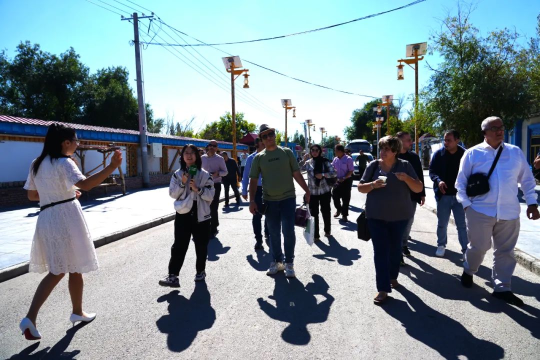 考察团一行在塔城地区裕民县江格斯乡阿克铁克切民俗村。塔城地区融媒体中心记者张培琪摄