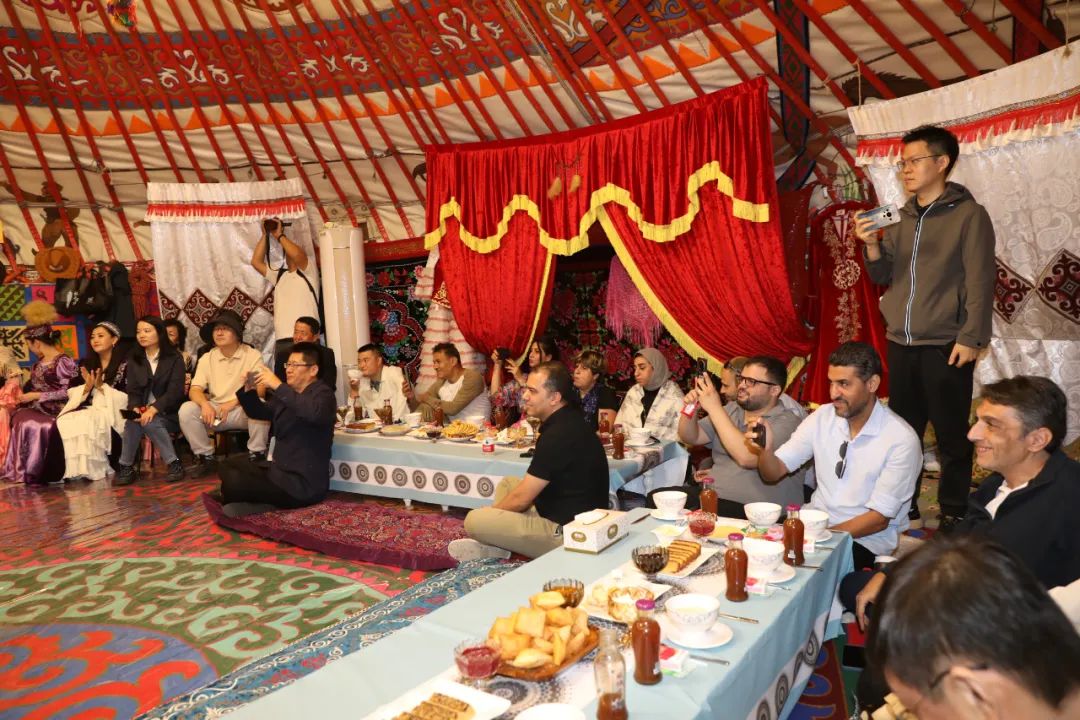 考察团一行在塔城地区裕民县观看歌舞表演,品尝民族甜点。塔城地区融媒体中心记者张培琪摄