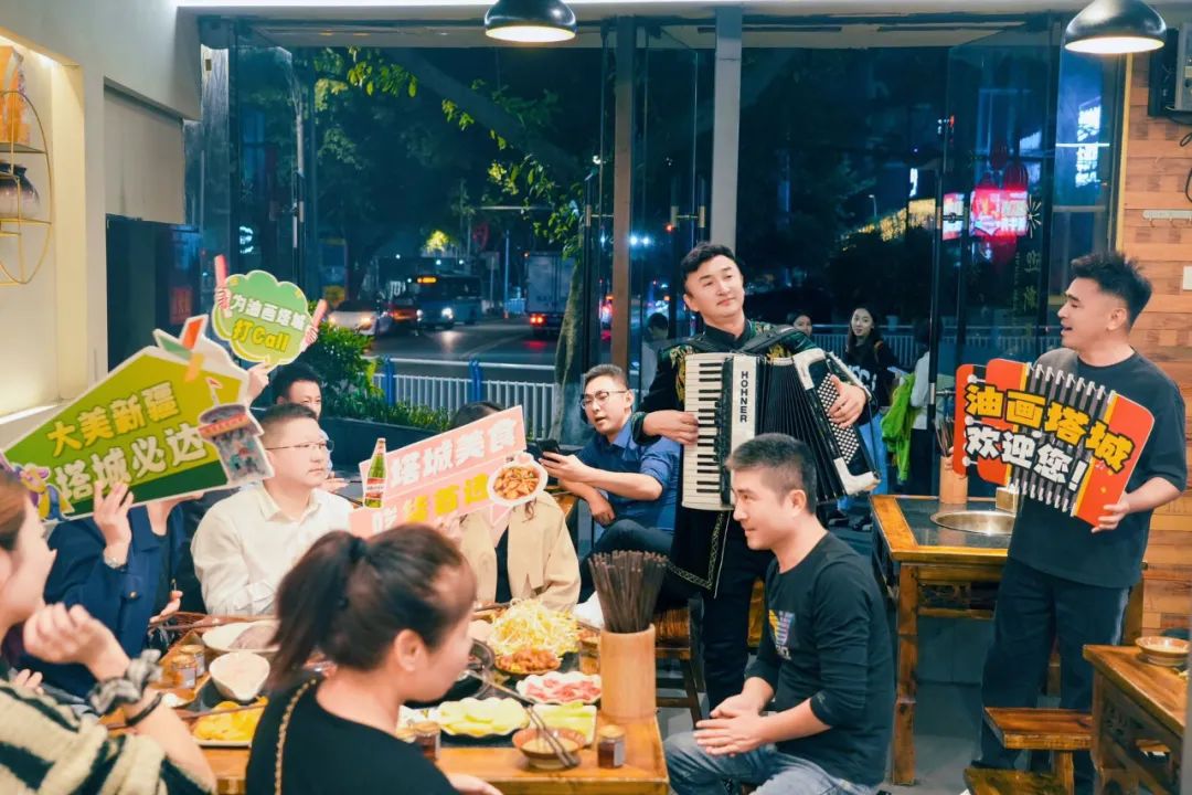 演员们载歌载舞,手风琴表演、特色舞蹈等节目接连登场,吸引了众多市民驻足观看。欢快的旋律、优美的舞姿,让整个火锅店都沉浸在欢乐的氛围中。演员们用热情和才艺展现着塔城独特的文化魅力,现场掌声不断,欢呼连连。