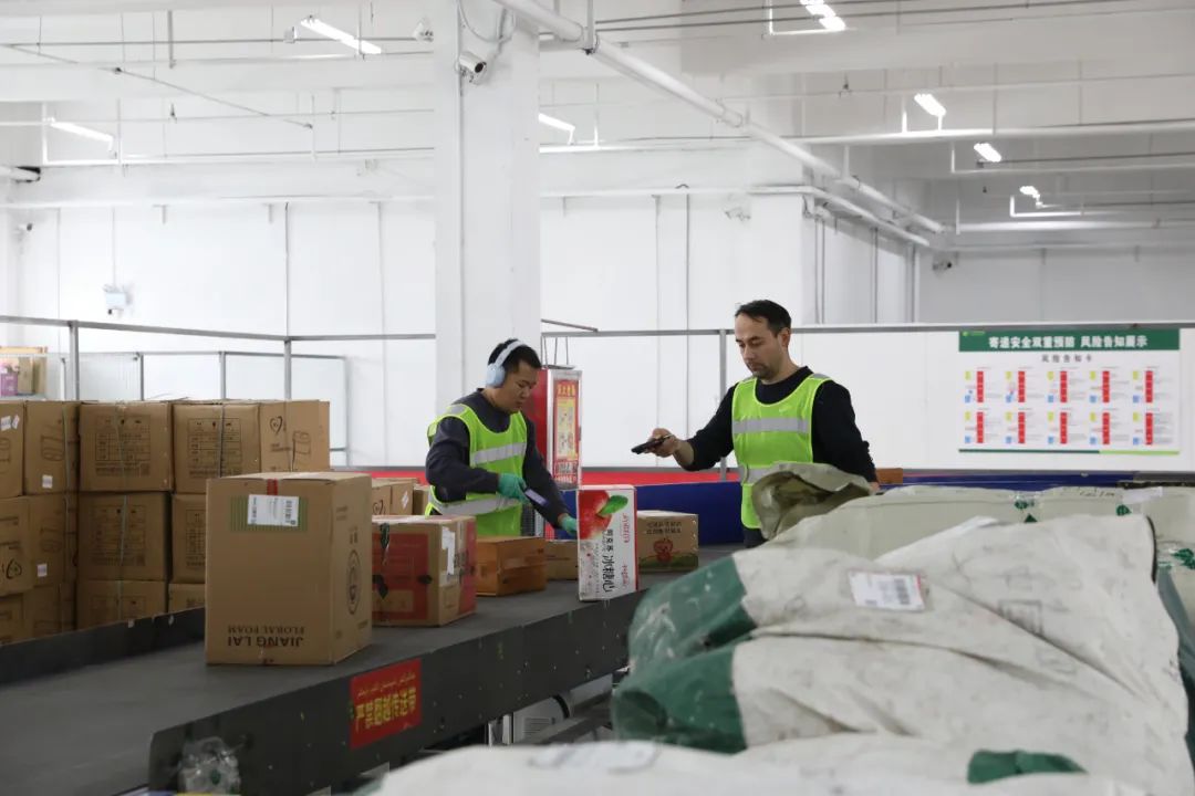 在分拣区,工作人员在流水线上有条不紊地进行分拣,通过自动传输设备,对常规快递进行区域分类扫描,识别条码后再将快递分拣到各快递员分管的区域。整个分拣中心内,各类自动化传输设备高速运转,工人们分工明确、配合默契,现场满是忙碌又和谐的热闹氛围。