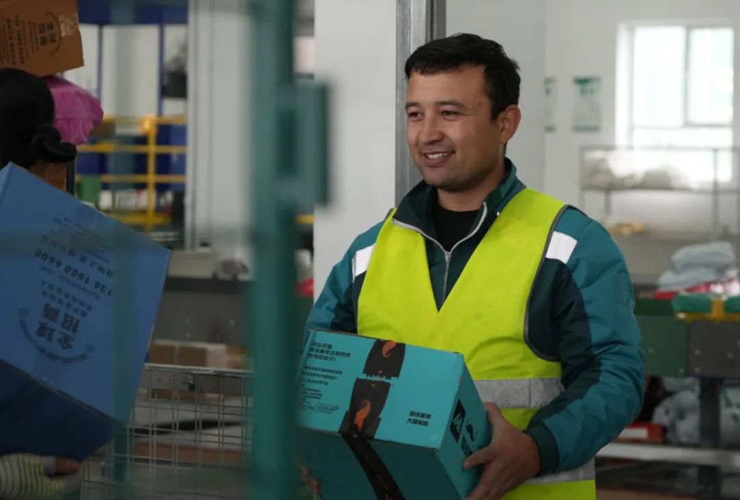 投递员海沙尔·赛丁江将自己片区的货物取出。