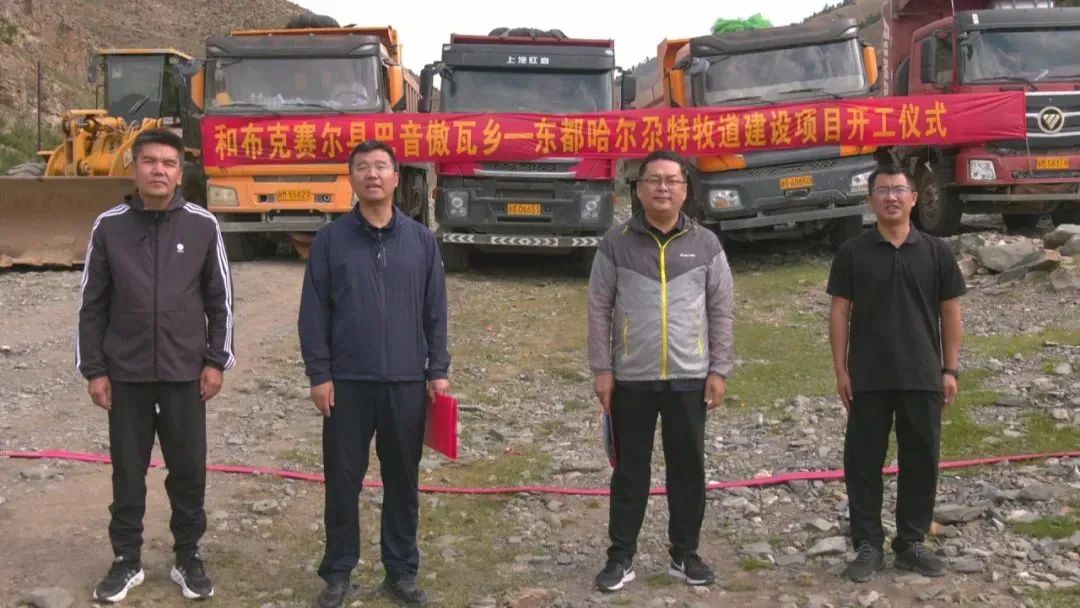 和布克赛尔县巴音傲瓦乡-东都哈尔尕特牧道建设项目开工仪式现场。