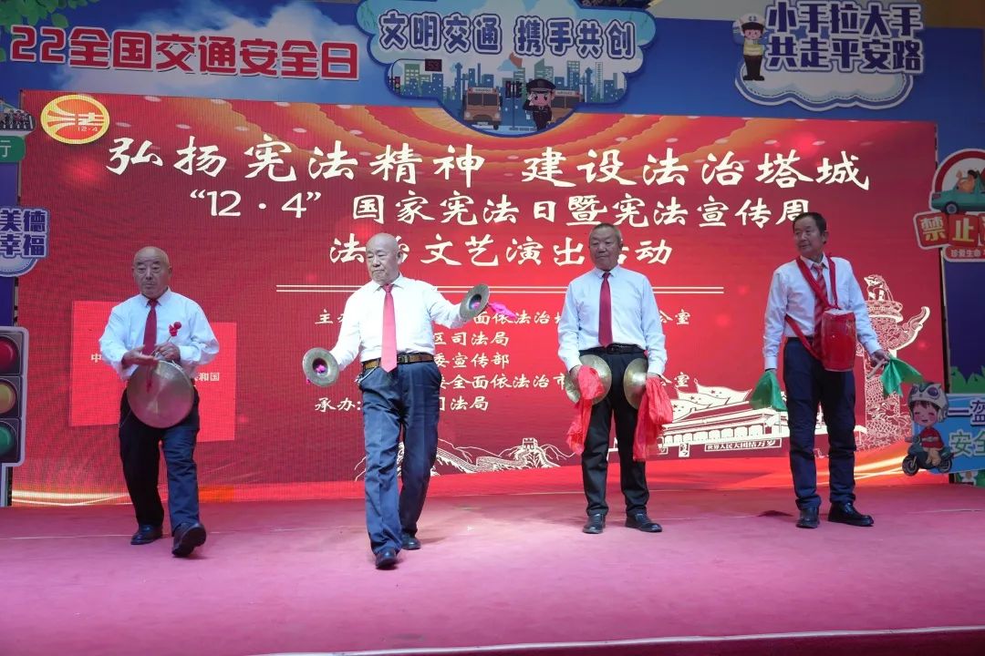 在文艺演出区域,由司法部门、社会组织、群众等组织开展的歌舞表演、宪法诗朗诵、三句半、法律知识有奖知识竞答等优秀法治文艺作品法味浓厚、趣味十足,吸引了现场群众驻足观看,掌声不断。