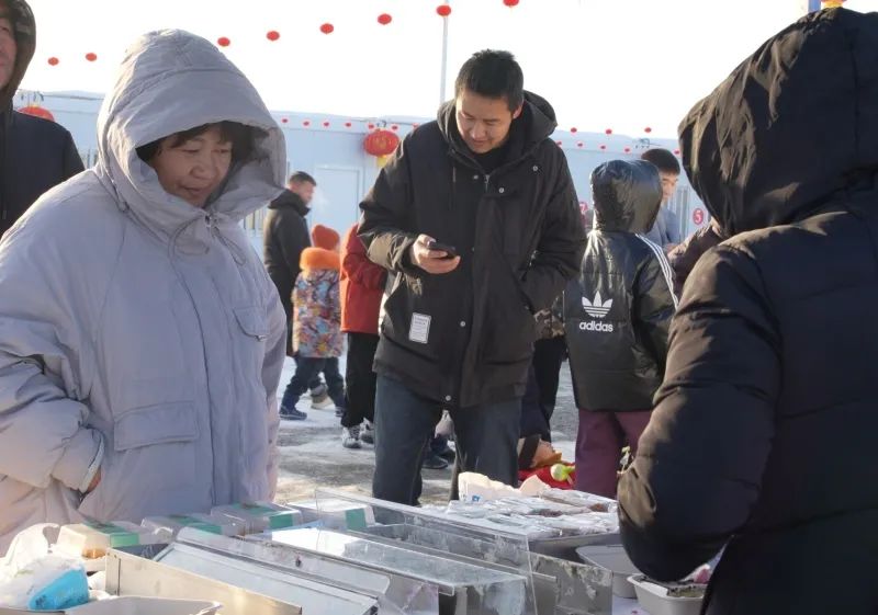 除了丰富有趣的冰雪娱乐项目,现场还设有农副产品、特色美食展销会区域,游客们可以在玩乐中尽情品尝地道美食,选购特色农产品。