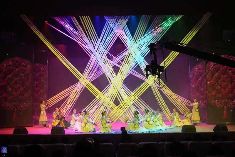 舞台舞美设计独具匠心,融合现代新型元素,彩绸舞、彩带舞交织成中国结、同心结等多种形式与图案,生动展现了新疆多民族文化。观众仿佛穿越时空,身临其境般置身于宝木巴草原的传奇世界。