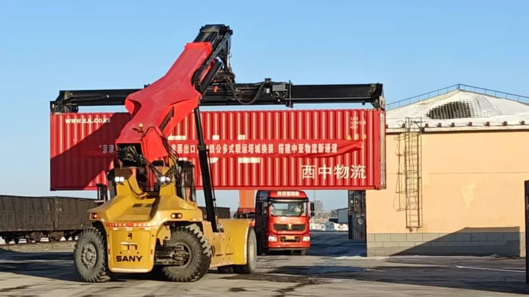 “京津冀-塔城·阿拉木图”首票出口货物铁公多式联运塔城换装现场。塔城地区融媒体中心记者比娜切尔·阿依亨摄