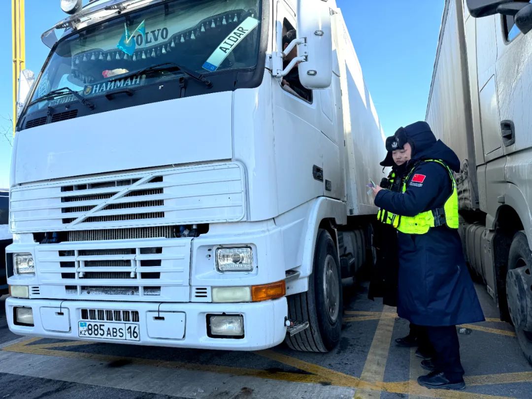 巴克图出入境边防检查站民警对出境车辆进行初检。塔城地区融媒体中心记者胡尔买提·木尔扎汗摄