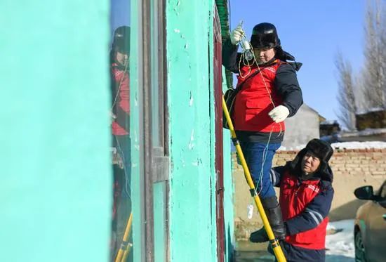 该乡哈拉苏村的依斯汗·阿吾巴克尔奶奶由于语言和行动不便,供电所工作人员便会不定期上门去看望。当天是元宵节,王旭和也尔森·恰尔甫哈孜巡线结束后,前去探望老人,送去生活必需品,还为老人检查和更换了老旧线路。