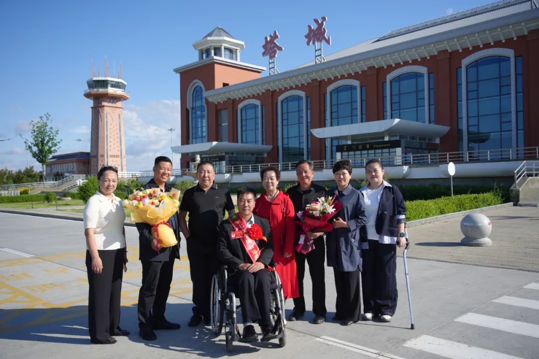 在塔城市千泉机场内,陈力锋同家人,地区残联、额敏县残联领导合影。塔城地区融媒体中心记者刘洪辰摄