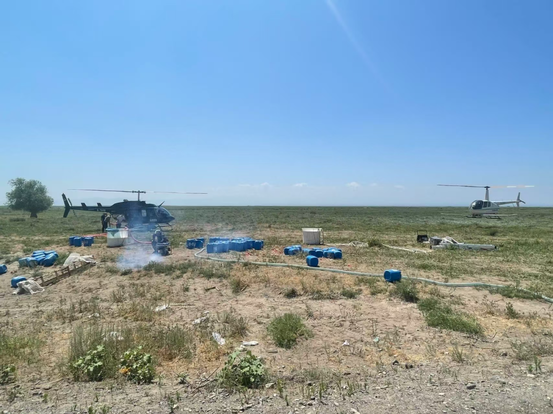 作为全疆首个实施兵地联合防治的区域,草防中心主动与兵团第九师白杨市协调,实现从“分片管理”到“协同作战”的转变。草防中心积极与军分区、民航等相关部门沟通,充分阐明跨区域防治紧迫性,最终成功调配4架直升机。通过直升机低空精准喷施生物药剂,3天内完成防治草场15万亩,防治效率显著高于传统地面作业与无人机作业方式。
