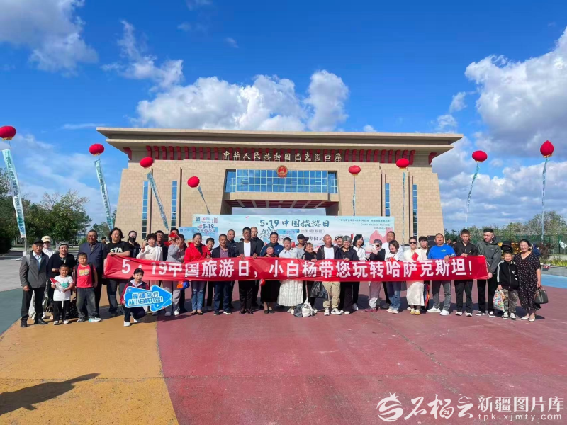2025年5月19日,参加“库鲁斯台草原—巴克图口岸—阿拉湖”跨境自驾游活动的游客合影。图/塔城地区融媒体中心提供