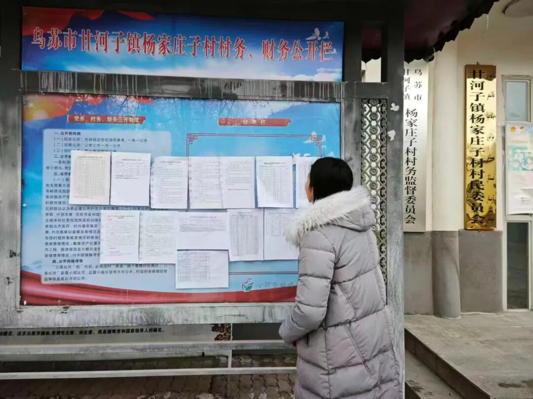 12月14日,乌苏市甘河子镇杨家庄子村村民在村级公示栏查看补贴发放明细等信息。