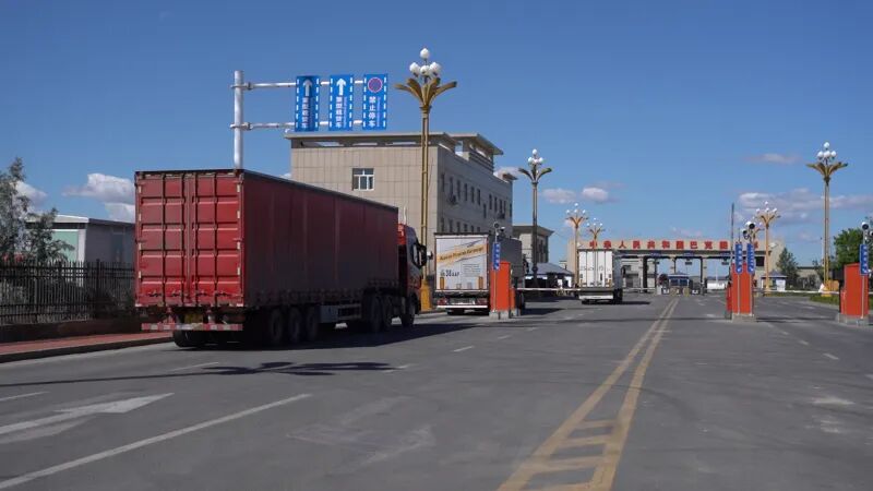 近日,走进巴克图口岸的公路运输通道,一辆辆满载集装箱的卡车正有序驶过智能卡口,径直驶向国门之外。