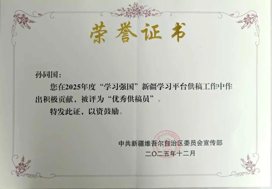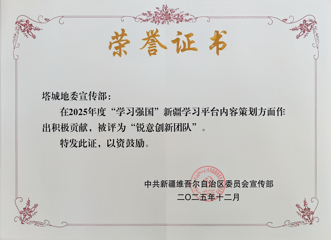 2025年12月30日至31日,自治区党委宣传部举办“学习强国”新疆学习平台工作推进会暨业务培训会,会上表彰了2025年在“学习强国”新疆学习平台供稿和宣传推广工作中表现突出的集体和个人。其中,塔城地委宣传部被评为“锐意创新团队”并在会上作经验交流发言,1人被评为“优秀供稿员”。