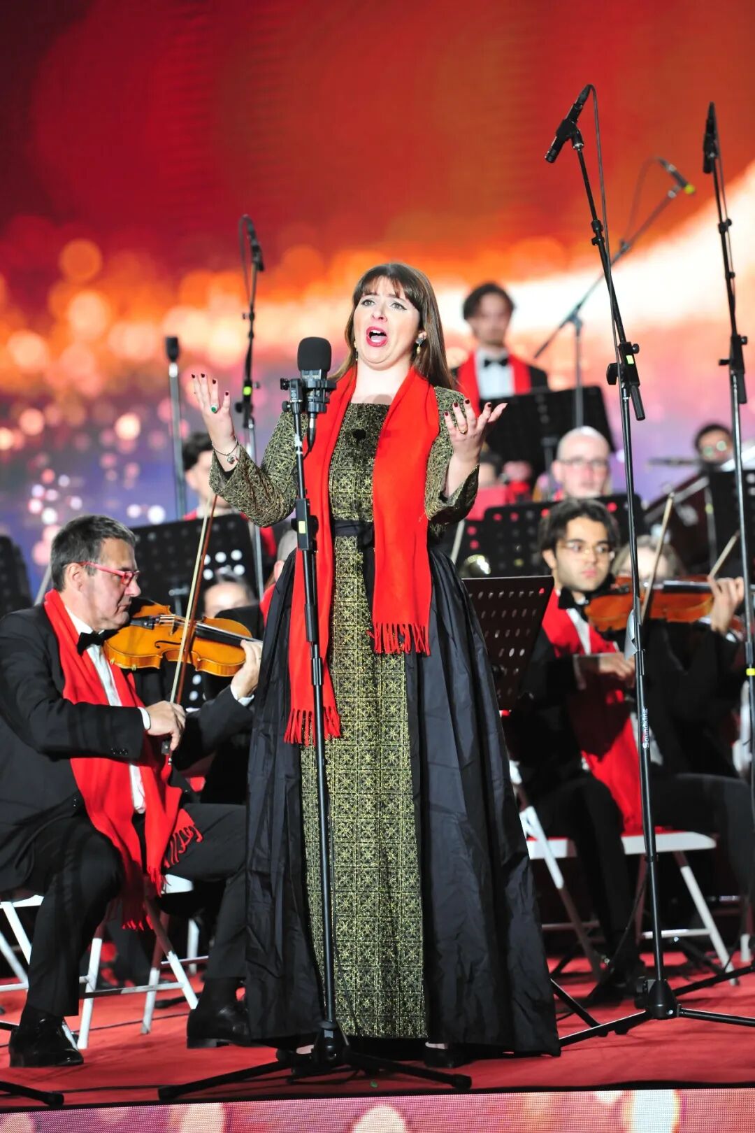意大利著名抒情花腔女高音歌唱家、歌剧表演艺术家丽贝卡·布鲁萨蒙蒂激情演唱。在全场观众的期盼与掌声呼唤中,音乐会迎来温馨的返场环节。多明戈·斯塔西与丽贝卡·布鲁萨蒙蒂联袂登台,倾情献唱《我爱你中国》。熟悉的旋律一响起,便点燃了全场观众的热情。歌唱家们用真挚的情感、婉转的歌声,唱出对中国的美好祝福,不少观众跟着旋律轻声哼唱。乐团还加演了《饮酒歌》《拉德斯基进行曲》等曲目,再度点燃全场热情。