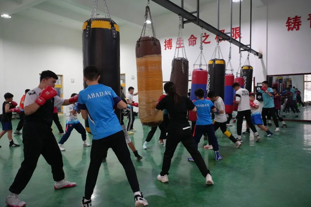 拳击训练馆内,选手们裹紧缠手带对着沙袋反复出拳,直拳干脆利落,勾拳沉猛有力,每一击都震得沙袋嗡嗡晃动。脚步在地面摩擦出细碎声响,全身心投入训练。