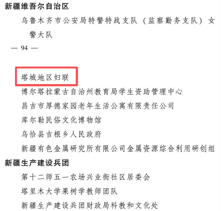 致敬“她力量”!塔城一集体荣获全国妇联表彰 2026-03-03 10:53:36 塔城零距离 点击:[] 打印 分享到: 今天(2日),全国妇联在京举行纪念“三八”国际妇女节暨表彰大会。大会表彰了9名全国三八红旗手标兵、598名全国三八红旗手、400个全国三八红旗集体、600个全国巾帼文明岗。其中,塔城地区妇联获得全国巾帼文明岗称号。全国巾帼文明岗名单 相关内容 【关闭】
