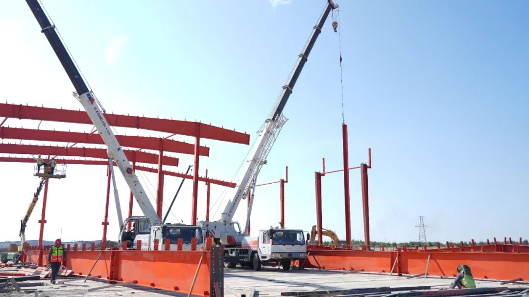 钢梁立柱吊装。塔城地区融媒体中心记者王高升摄
