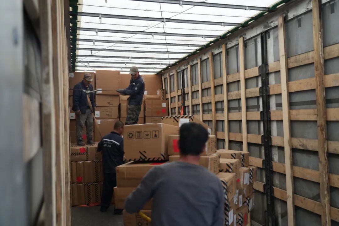 当日,在跨境电商库区前,工人们正在往大货车上装货、摆货。新疆盛大兴泰商贸有限公司业务经理李学峰一边指挥工人们装车,一边登记货物。他告诉记者,这些货物将在当日下午出口欧洲国家,如比利时、德国、英国等。