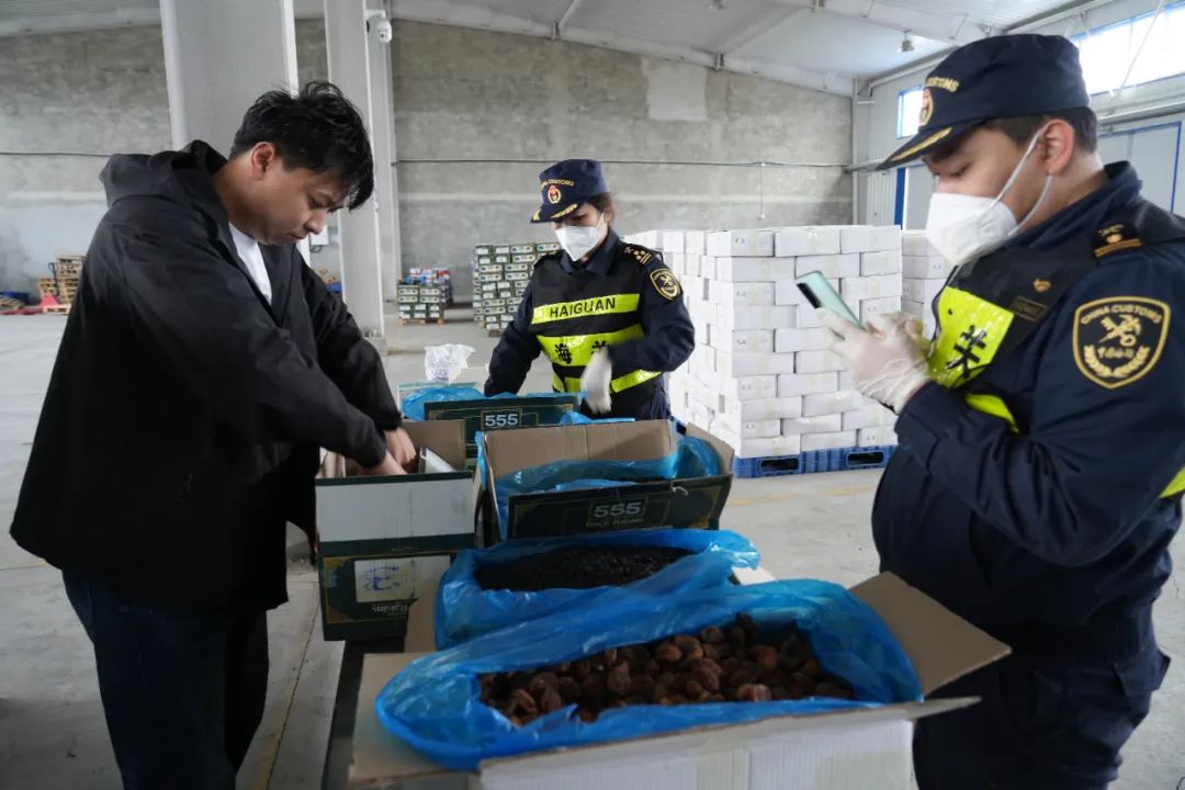 塔城海关关员查验边民互市进口干果。塔城地区融媒体中心记者马合巴勒·木尔扎汗摄