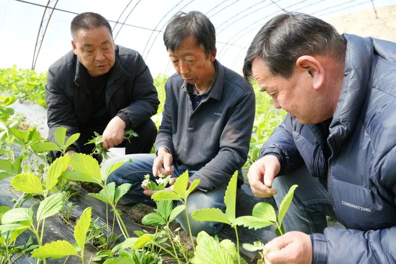 查看草莓长势。塔城地区融媒体中心记者马合巴勒·木尔扎汗摄