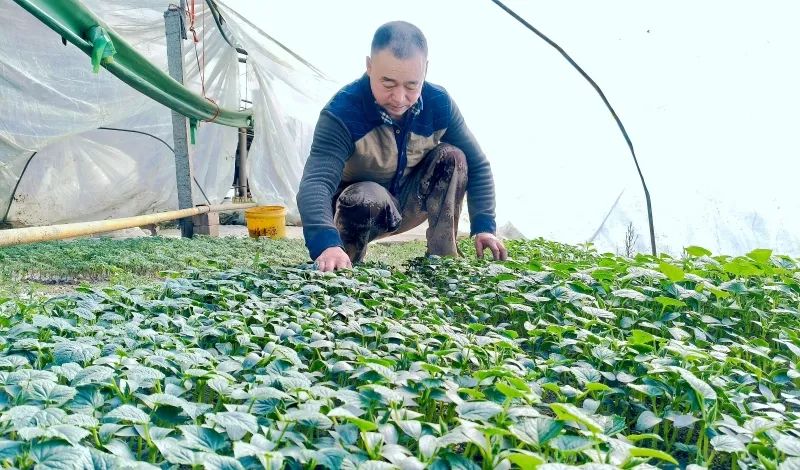 在村民吕智家的大棚里,辣椒、茄子、黄瓜、草莓等各类蔬果幼苗排列得整整齐齐,吕智穿梭其间,仔细检查着幼苗的生长情况,脸上洋溢着喜悦。