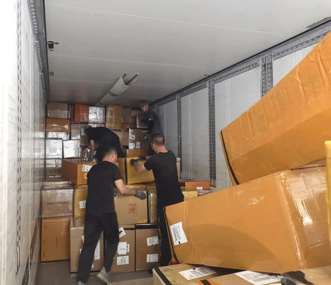 (图为新疆盛大兴泰商贸有限公司库区忙碌装箱的工作人员。朱歆柯穆摄)
