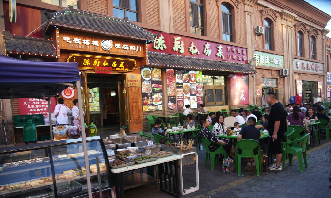 6月8日,在沙湾市大盘美食一条街。记者看到,各家店铺里人气火爆,座无虚席,来自全国各地的食客纷纷前来打卡,体验地道特色风味美食。随着假期持续,各餐饮企业也是充分准备,以最优质的服务迎接八方来客,让每一位游客都能享受到地道的风味美食。