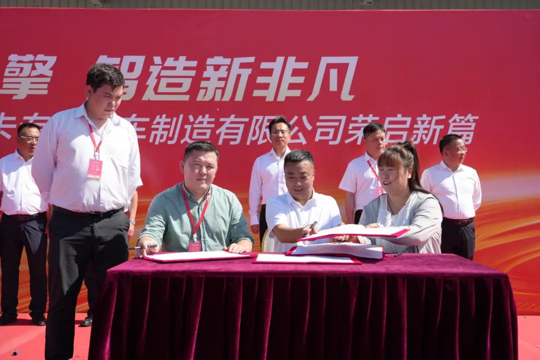 签约仪式现场,地区相关部门领导、行业主管部门负责人、哈萨克斯坦相关行业代表、哈萨克斯坦合作企业负责人、业务合作伙伴和企业嘉宾、国内企业领导、合作伙伴代表、供应商代表、经销商代表等参加了签约仪式,仪式上相关领导宣布项目正式落地并为下线车辆揭牌。