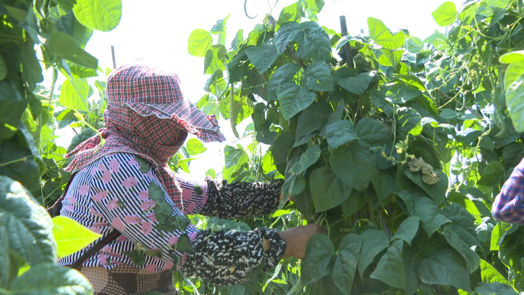 6月15日,在乌苏市八十四户乡巴海村的蔬菜种植基地,玉米、豆角、西红柿等作物长势喜人、挂满枝头。工人们在紧张有序地进行采摘、分拣和打包作业。