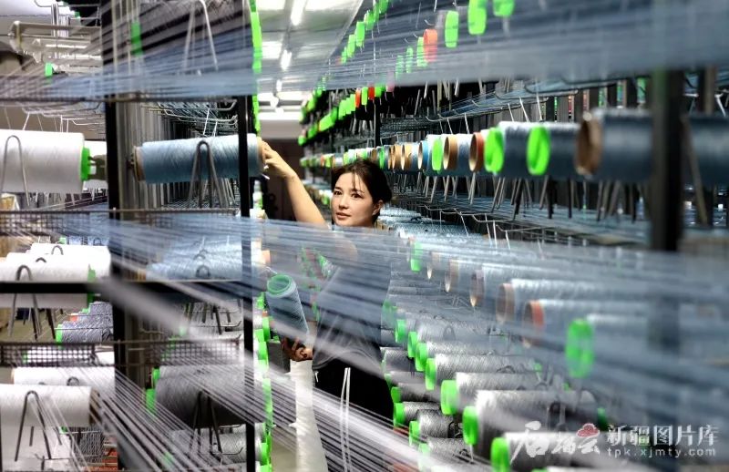 6月28日,工作人员在新疆天目湖地毯织造有限公司生产编织地毯的纺线。