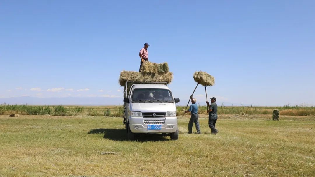 额敏县二道桥乡萨尔巴斯村村民阿依加辽克·阿勒木江说:“我们家有50多亩地草场,今年预计打个480捆,今年草长得好,现在使用机械化,一天就可以打完了。今年打得草就够牛羊过冬了,秋天我们再买点包米秸秆就可以了。”