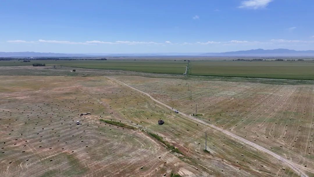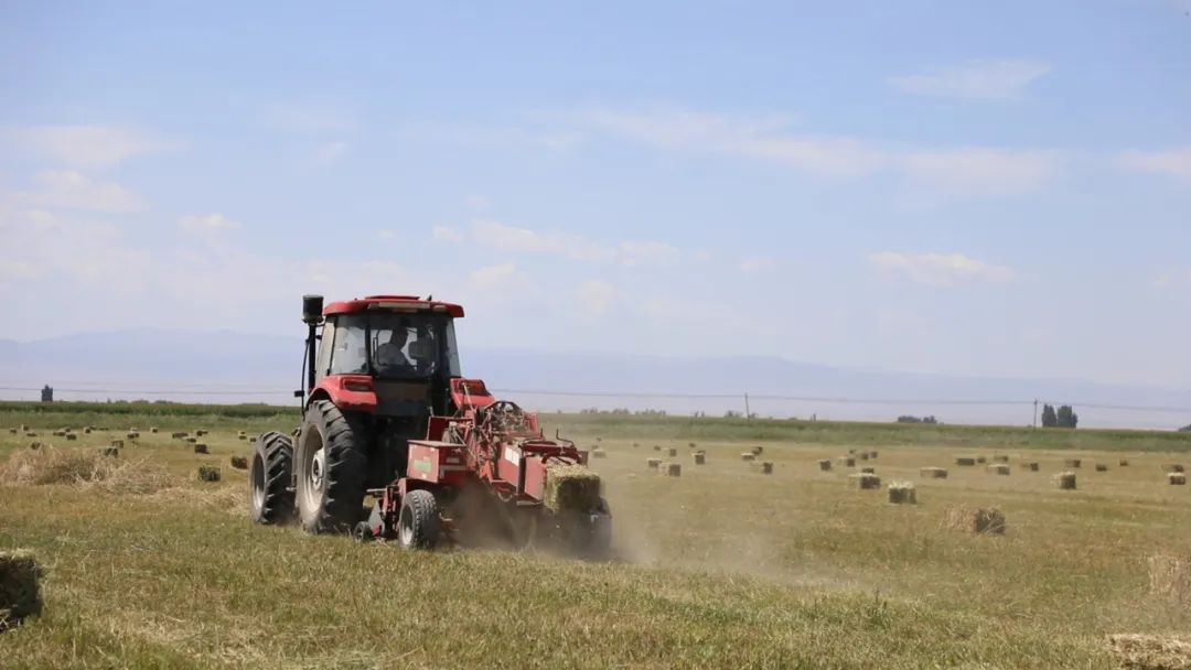 在额敏县库鲁斯台草原,牧民们抢抓晴好天气全力投入牧草收割,大型搂草机将割倒的牧草迅速搂集成整齐的草条,捆草机将松散的草条压实、捆扎成一个个紧实规整的草捆。