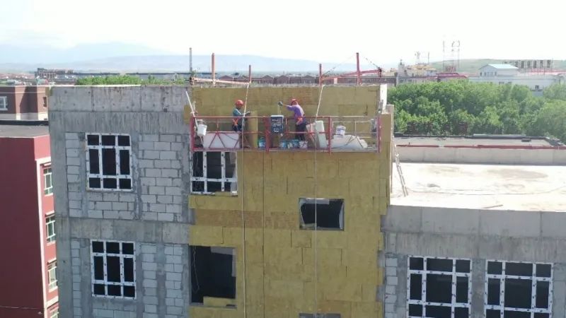 施工人员在做外墙保温。沙湾市融媒体中心记者马金明摄