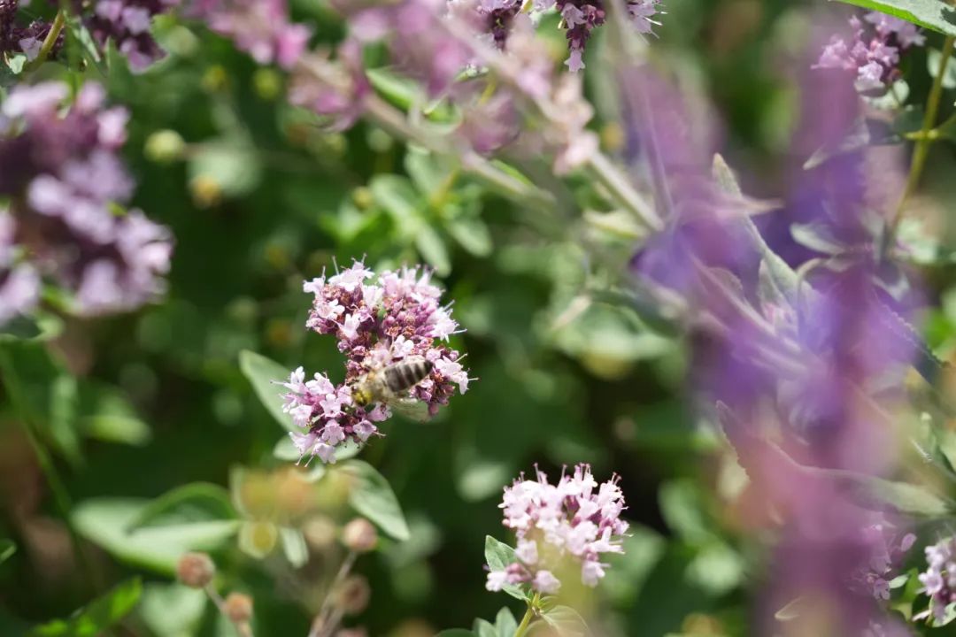 蜜蜂在花丛中采蜜。塔城地区融媒体中心记者代姣美摄