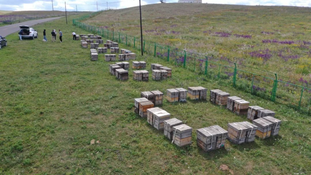 分布在吐尔加辽草原的蜂箱。塔城地区融媒体中心记者汪春林摄