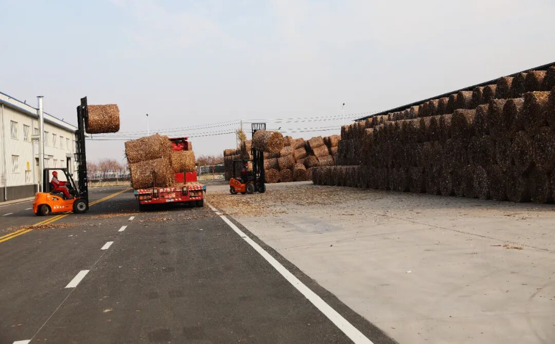 中城宏泽(新疆)生物科技有限公司厂区工人在卸棉花秸秆。